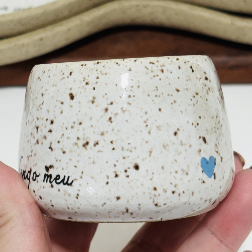 -Volume: aproximadamente copo 100ml, personalização escrita "dengo meu" na frente e "meu dengo" no lado oposto, com um coração nas laterais.